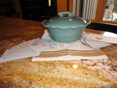 This week’s drawing item is a gorgeous: Casserole dish, lid, tea towel and recipe card set. This delicate green casserole dish with lid prominently features the word “Gratitude” embossed in the ceramic. Your collection also include a beautiful proverbs tea towel and 20 recipe cards in coordinating colors. It is the perfect gift for the chef in your life, a newlywed and anyone who love to entertain!